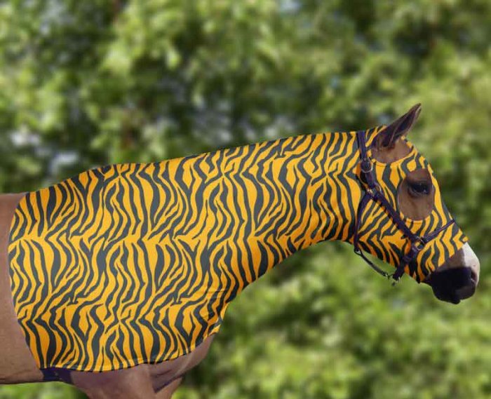 In general, most horses tolerate things pulled over their heads. Therefore, putting on your horse’s Halloween costume is easy to do. Open the noseband Velcro. Bunch up the slinky and slip it over your horse’s head. Adjust the holes until your horse’s eyes and ears are in the center.  Slide the remaining slinky over the neck and shoulders. Close the girth attachment. Close the noseband Velcro. Finally, your horse sleazy costume should fit smoothly, like swimwear, but not tight.
